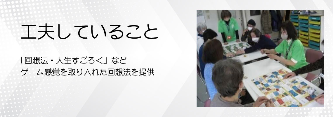 具体的には、「回想法・人生すごろく」や「紙芝居(昭和の思い出)」を使い、利用者さんにゲーム感覚を取り入れた回想法を体験していただいたり、体操で息が上がった後に、ミニ回想法を行い、身体をクールダウンさせつつ回想法を体験していただいています。